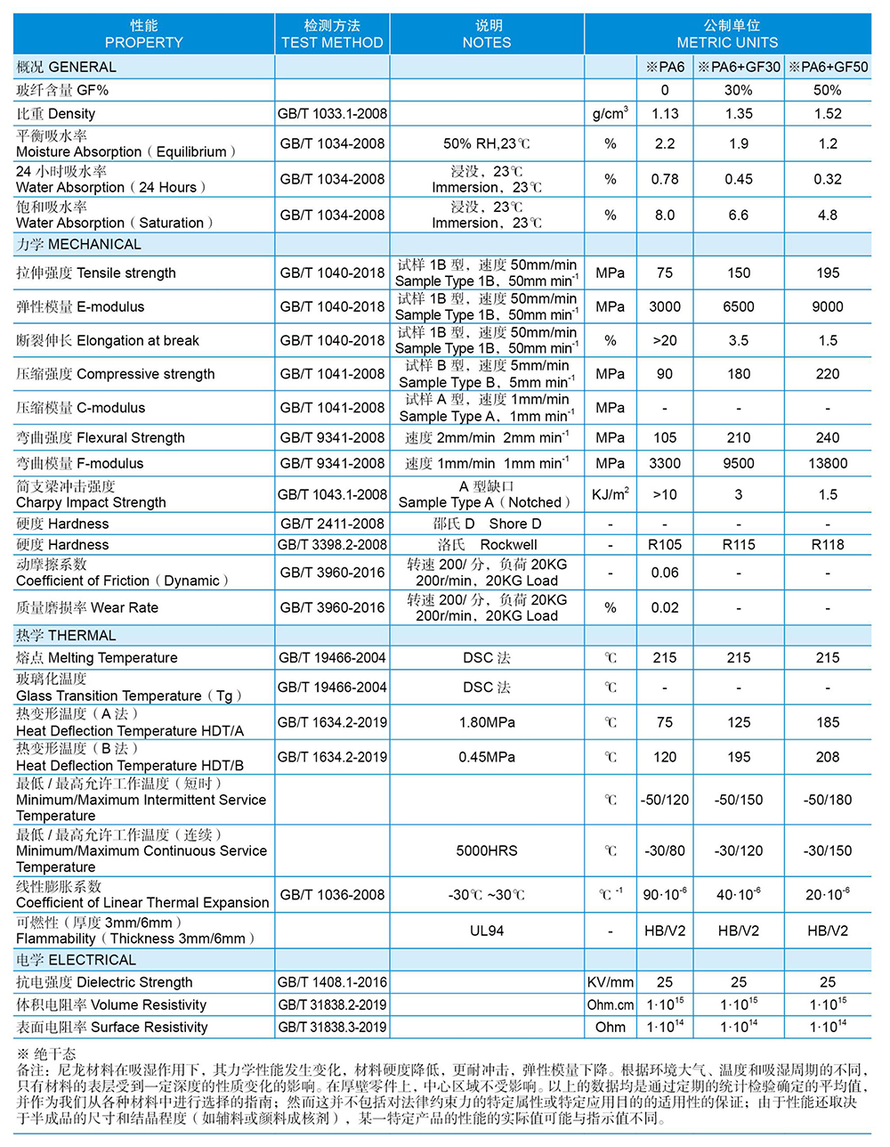 尼龍6是己內(nèi)酰胺單體( C6H1 1NO)水解開環(huán)聚合的產(chǎn)物,水解聚合是指己內(nèi)酰胺在高溫熔融狀態(tài)下當(dāng)有少量水作為引發(fā)劑條件下,采用間歇或連續(xù)聚合操作可制得半透明或乳白色的尼龍6聚合物。純尼龍6力學(xué)強度較高,有良好的耐沖擊性,具有優(yōu)良的耐磨性和自潤滑性;但尼龍6吸水率較高,尺寸穩(wěn)定性較差,工作溫度范圍較窄;通過玻璃纖維( GF )改性后,可大大增強尼龍6的機械性能和尺寸穩(wěn)定性,短時工作溫度上限可提高至熔點附近。尼龍6的成型加工通常采用注射成型和擠出成型。